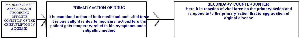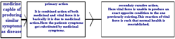 Homœopathic medicine chosen based on account of the similar affection it produces on healthy individual. Here homoeopathic medicinal symptoms occupy the place of morbid derangement present in the organism as a similar, stronger artificial disease (drug disease), and step into the place of original natural derangement. A small dose of dose every one of the homoeopathic medicine produces a primary action that is perceptible to a sufficiently attentive observer. But living organism employs against this primary action only so much reaction as is necessary for the restoration of the normal condition.