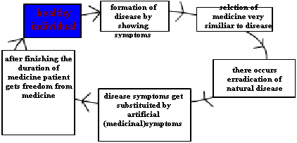 Diseased individual Þ matching of portrait of medicine to that of disease (selection of homoeopathic medicine) Þ there occur removal of natural disease and natural disease gets substituted by artificial medicinal disease Þ each and every medicine has its own duration of action and after finishing the duration of action of medicine he will get cured from both artificial medicinal disease as well as original disease Þ Former sate of health is restored.