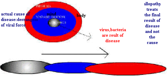 In order to cure permanently derangement from the centre (vital force) should be corrected and not in the ultimate pathology which is only the result of the disease. Allopathy physician may remove virus ,bacteria etc by powerful anti viral treatment for the former and antibiotics for the latter believing that they have removed the disease by removing bacteria or viruses. We can see that bacteria and viruses are product of disease and not the cause. Cause of the disease is different from the ultimate result of disease which may be virus, bacteria etc. Cause is in the centre (vital force). Killing virus or bacteria (by anti viral or antibiotic )does not relieve the disease because they are the product of disease. Soon after the treatment by so called antiviral or anti bacterial medicines (allopathy) the centre should finds expression through some other organs and disease affects newer organ. Only way to treat is treat the centre which is dynamic by dynamic medicine (Homoeopathic medicine)
